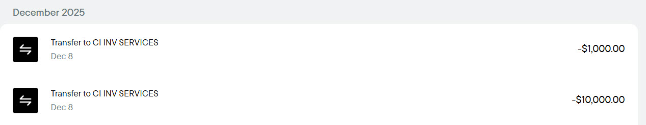 These transactions were a $10,000 transfer to CI Investment Services Inc. and a $1,000 transfer to CI Investment Services Inc. simultaneously at 2:03 PM December 8, 2025.